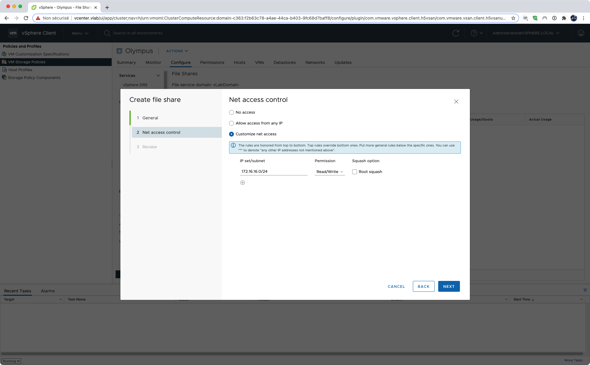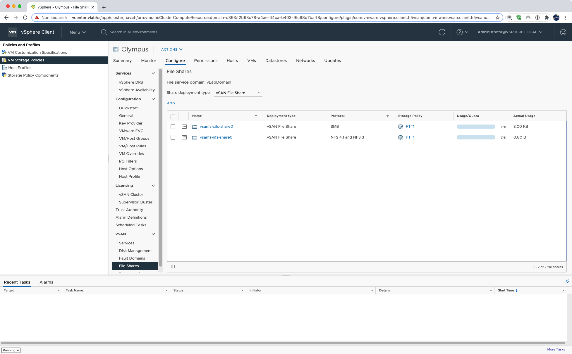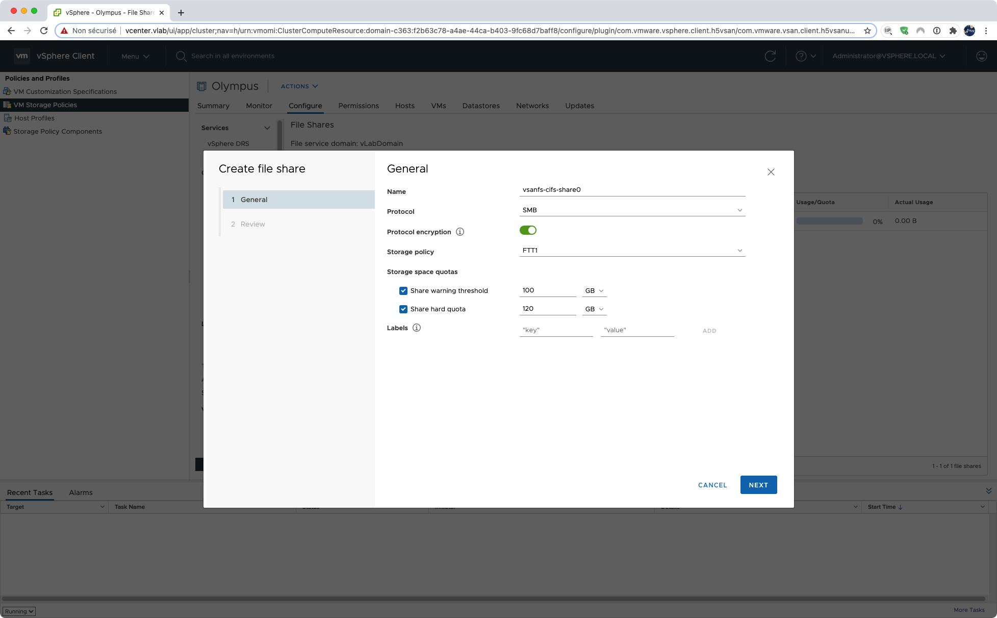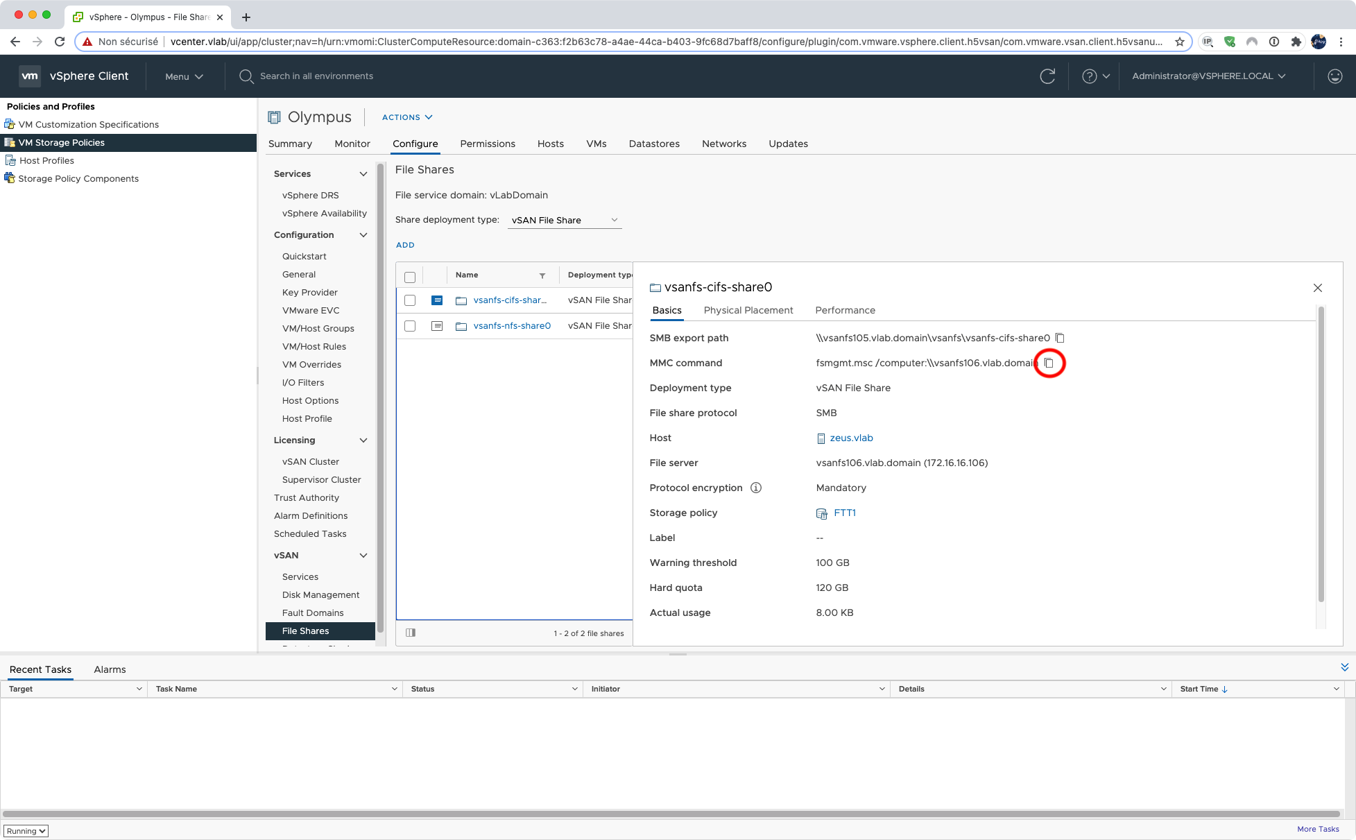 La création de share, qu’ils soit NFS ou SMB, ne pose pas de problème non plus à travers vSphere, comme vous pouvez le voir. Chaque share donne une visibilité de toute la volumétrie disponible sur VSAN a l’instant T, par contre, des volume-quotas sont disponibles, pour réfréner la nature, car comme vous le savez, la nature a horreur du vide !