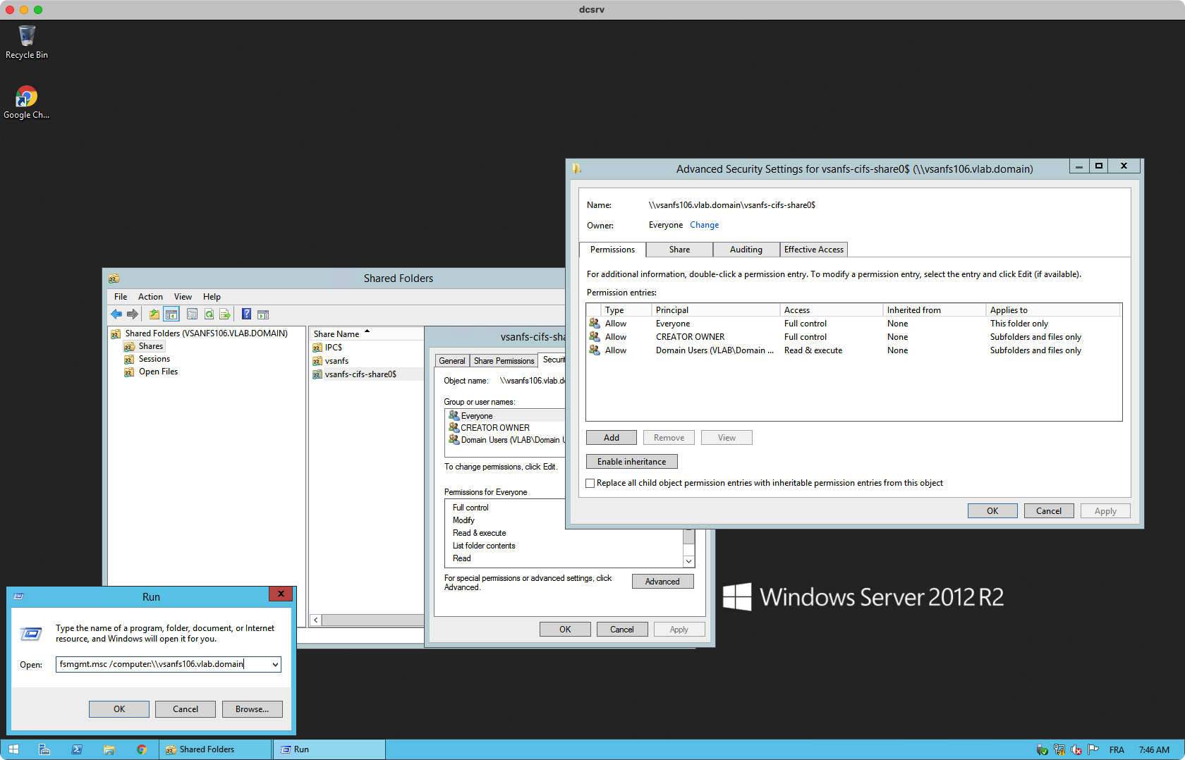 Vous noterez que les UNC/URI des shares sont parfaitement détaillées et peuvent être directement copiées/collées depuis leur page de description. De même, pour les shares SMB, on peut même utiliser le snapin Windows dédié pour travailler sur les droits d’accès, pour le coup, je trouve ça très pratique.