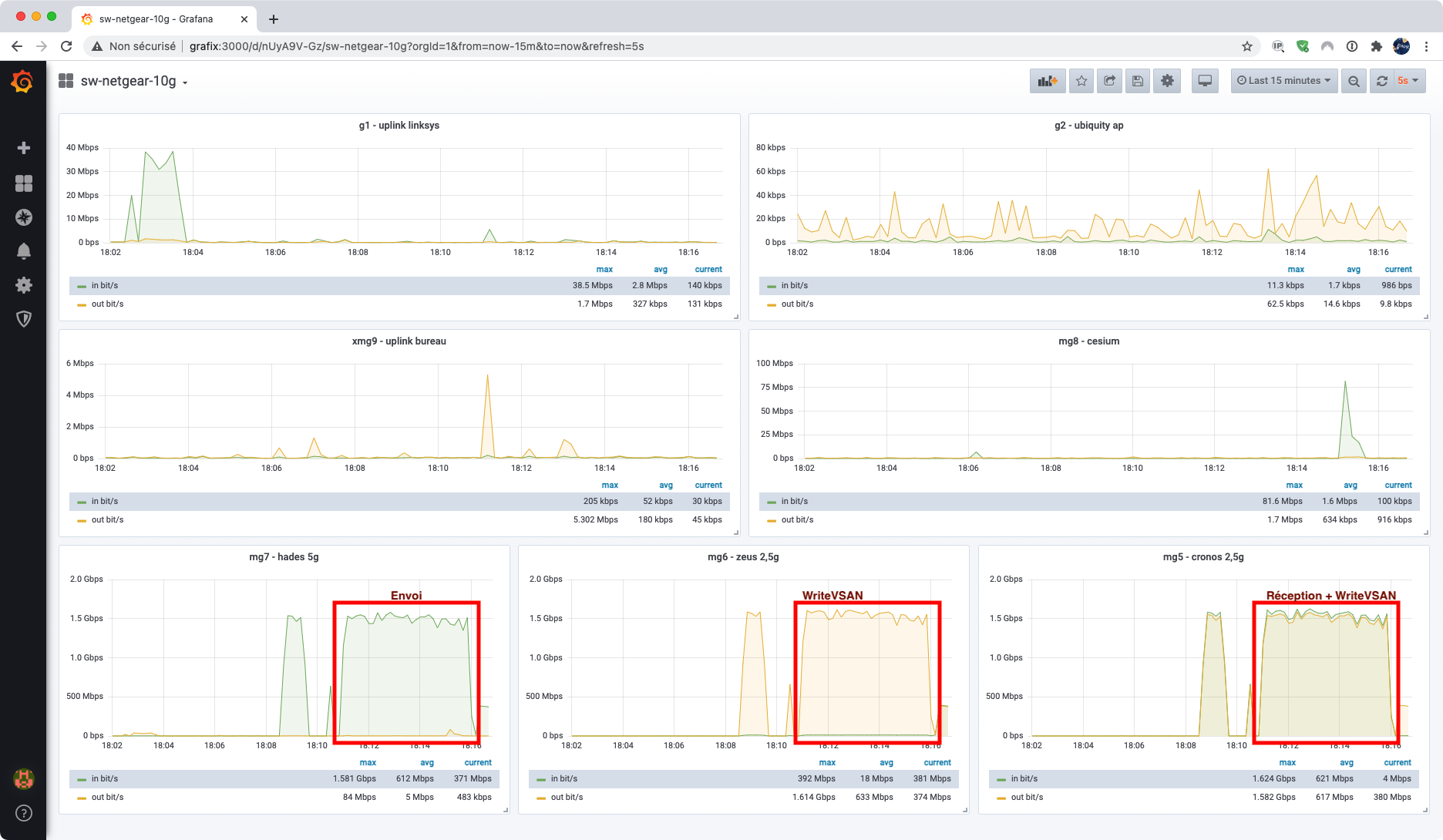 J’ai fait quelques essais de performances de transferts. Ca vaut ce que ça vaut, c’est à dire pas grand chose, mais il semble que CIFS et NFS soient au coude à coude, les essais étant été réalisés avec une VM Linux sous CentOS, ainsi que sous Windows 2016. Les débits, par rapport aux capacités de mon vLab, sont très proches des maximums que j’imaginais pouvoir atteindre, sachant que l’ensemble des flux VSAN, File Services et manager sont tous routés vers des interfaces 10G qui synchronisent, sur les deux machines qui participent au cluster 2-node (zeus et cronos), à 2,5 Gbit/s. On obtient entre 150 et 180 Mo/s soit environ 1,5 Gbit/s. Sur les graphiques Grafana des interfaces, on constate bien l’envoi par la machine source, ainsi que la réplication « temps réel » du FTT1 dans le cluster. Pour autant, je ne peux pas dire si la limite de 1,5 Gbit/s est liée à mon setup ou à une contention interne software. Je n’ai pas pu obtenir plus en tout cas. Si vous vous intéressez à la chose, ne faites pas l’économie un petit PoC et quelques workshops sur le sujet, cela me parait indispensable étant donné la jeunesse du service !