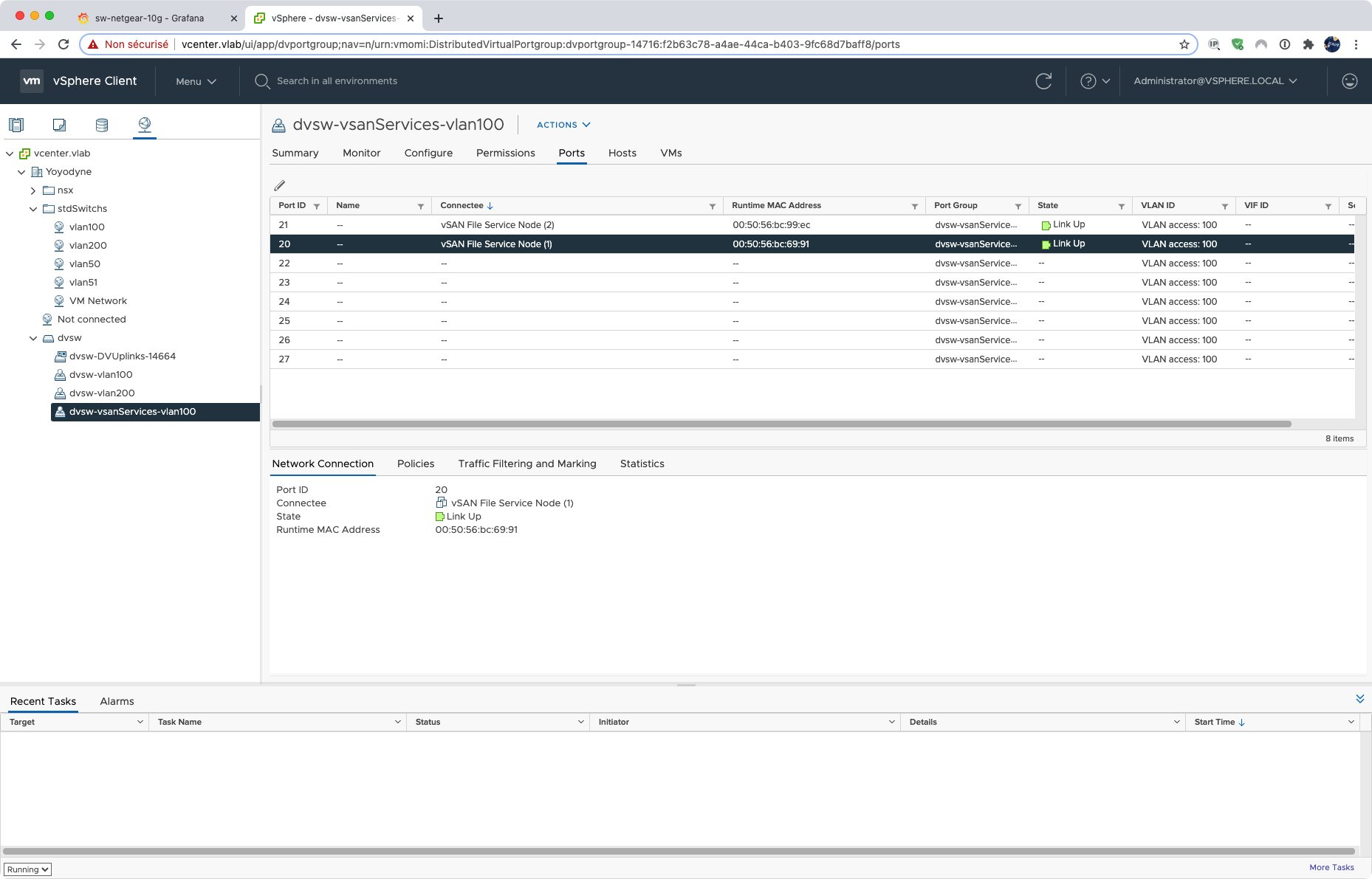 Plus surprenant, je me suis rendu compte sur la machine cliente qui faisait les transferts, les deux mac-address des deux têtes NAS du cluster n’étaient pas des mac-adress VMware traditionnelles en 00:50:56:xx:xx:xx mais des mac-address « Docker » en 02:42:xx:xx:xx:xx . Pour le coup, ça semble logique (étant donné que la plateforme de service est visiblement du PhotonOS). J’imagine que ces têtes NAS de service sont plus ou moins stateless et tirent leurs données des API vSAN. Le fait d’avoir des mac-adress flottantes et différentes de la VM de service permet aussi sans doute de pouvoir changer d’identité réseau très vite en cas d’indisponibilité d’un ou plusieurs ESXi.