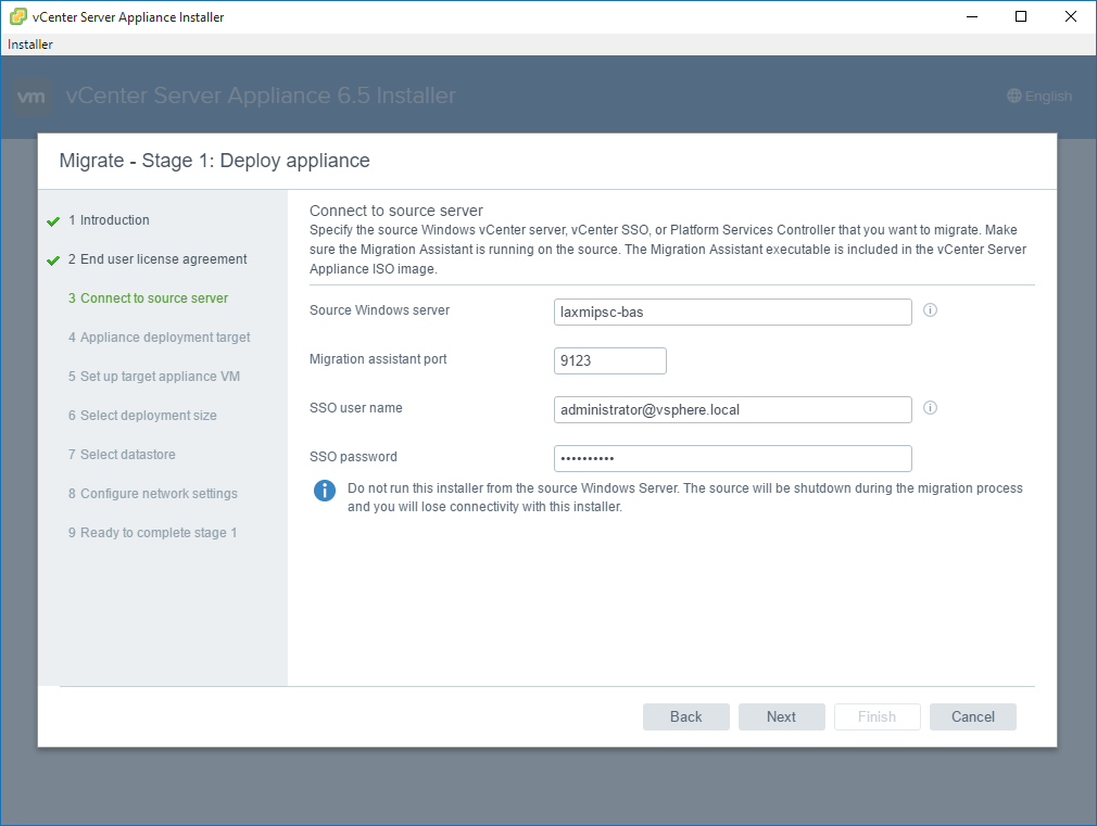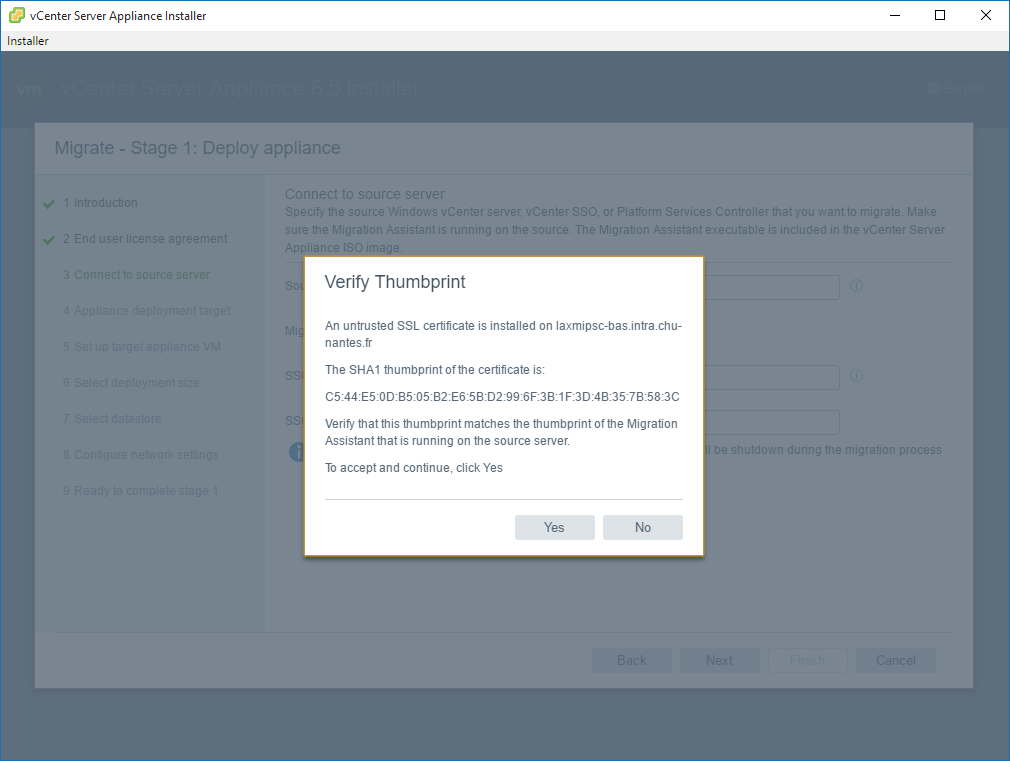 … si tout se passe bien, après validation de la signature SSL de l’assistant de migration distant, on poursuit avec les coordonnées du vCenter (ou de l’ESXi) qui va servir à déployer la nouvelle appliance ainsi que les caractéristiques temporaires de cette dernière (localisation, nom, réseau connecté etc.) :