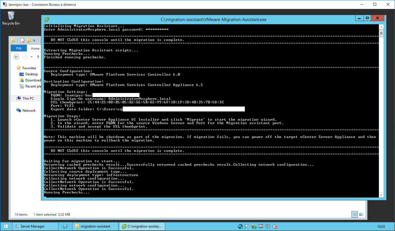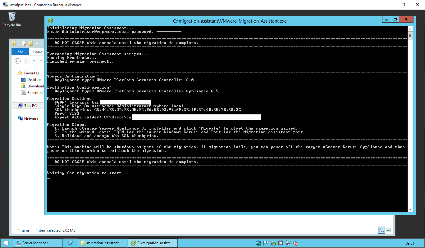 Première chose à faire : on installe le « migration assistant » sur la machine cible (la machine Windows). Il s’agit assez simplement d’un exécutable à lancer sur la VM windows exécutant les services PSC (on fera de même pour les services du vCenter plus tard). L’exécutable est contenu dans l’ISO globale d’installation de la VCSA 6.5 sous le répertoire « migration-assistant ». Vous copiez ce répertoire quelque part sur la machine et vous lancez l’outil. En quelques minutes, celui-ci va extraire les différents fichiers et packages nécessairent puis se mettre à l’écoute de connexion entrantes sur le port 9123.