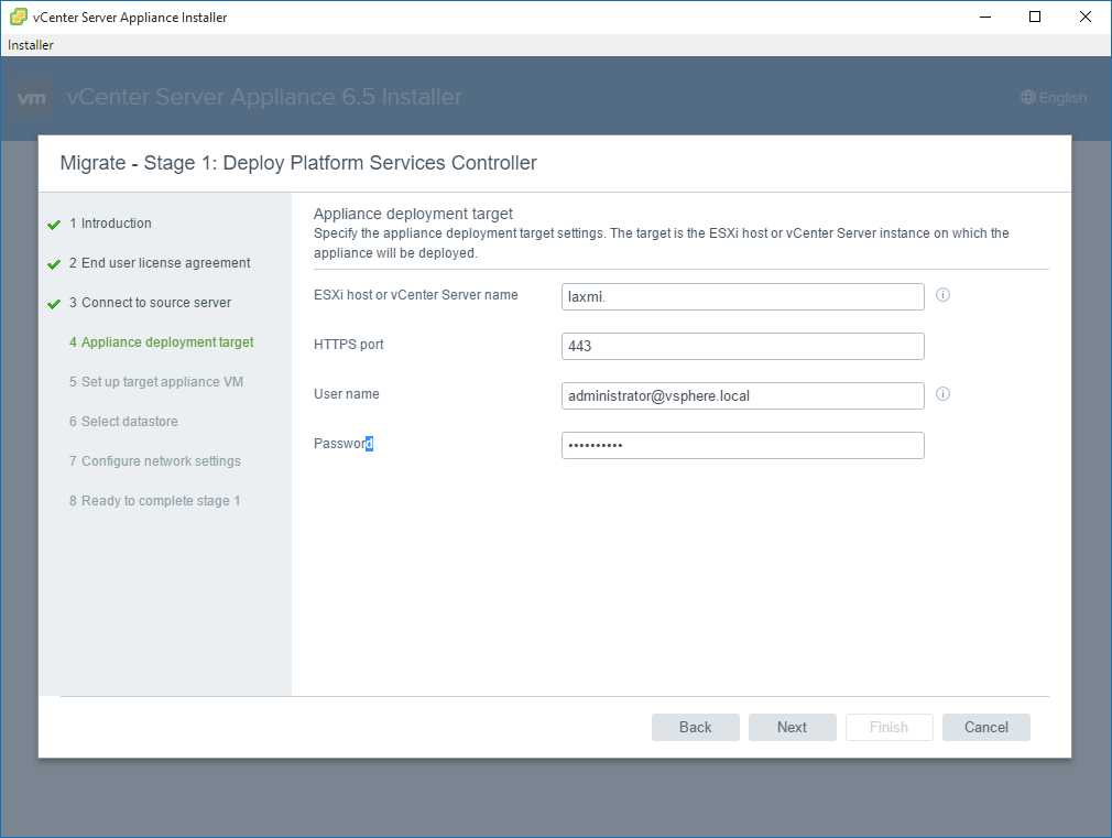 Ensuite, on va tout simplement démarrer l’assistant de migration vSphere depuis l’iso d’installation et renseigner les informations de la machine PSC à migrer :