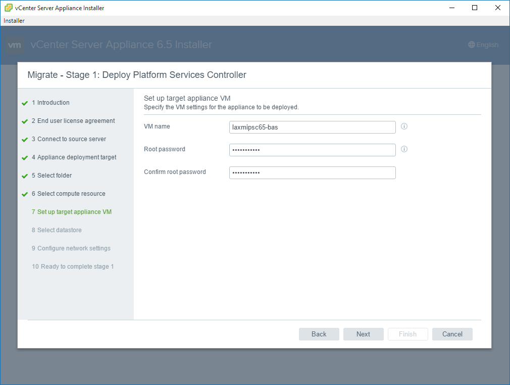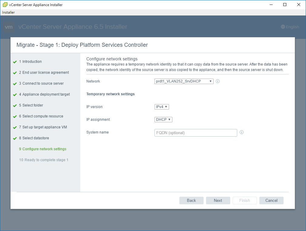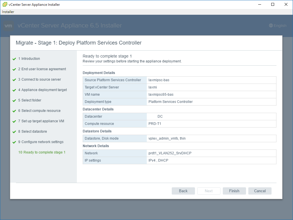… ici, c’est relativement facile, la seule chose à bien vérifier c’est que votre appliance doit être connectée au même subnet/vlan que la PSC à mettre à jour. En effet, une fois la migration terminée, l’appliance va reprendre l’identité réseau de l’ancienne machine (après l’avoir éteinte) et du coup, elle doit avoir accès à un vlan identique à la source. Ca parait évident quand on le dit comme ça, mais quand, comme moi, on se lance dans cette upgrade en faisant 3 trucs en même temps, on loupe rapidement cette particularité 😉 … RTFM, comme toujours !