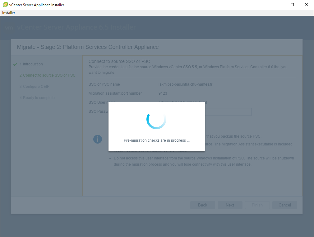 Pour la seconde phase, c’est plus simple encore. L’assistant se connecte à la PSC existante, importe les données, reconfigure la nouvelle appliance PSC (reconnexion Active Directory et paramètres réseau). Voici quelques copies d’écran de l’assistant ainsi qu’une image des traces affichés sur le démon « Migration assistant ».