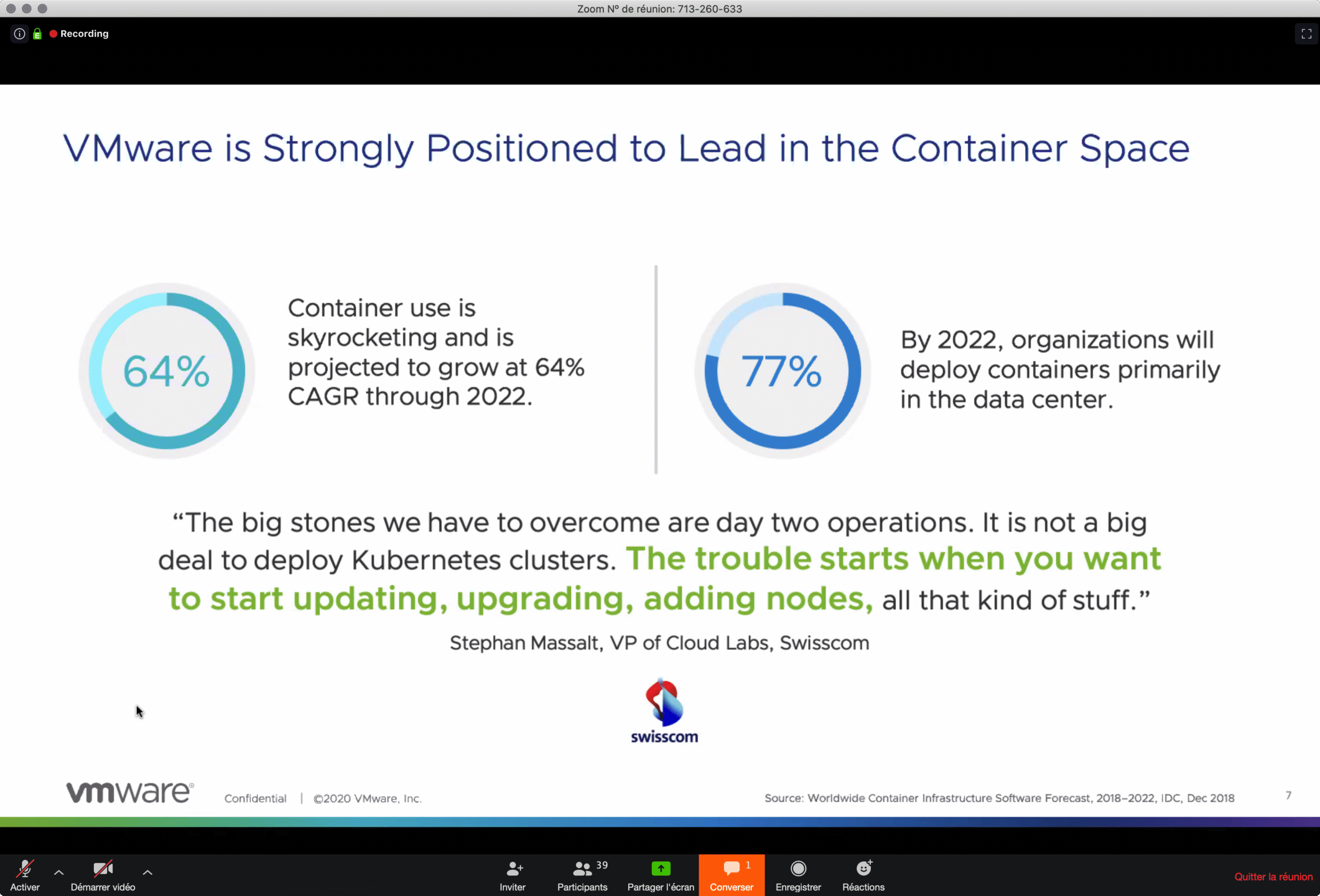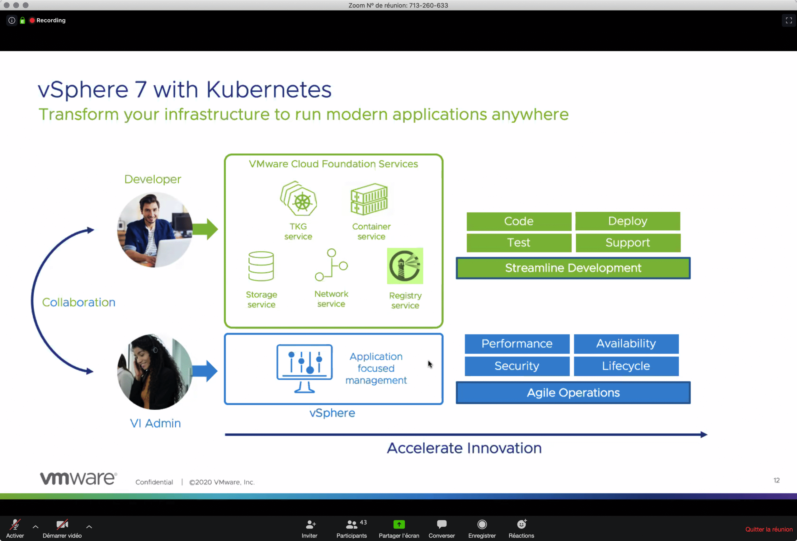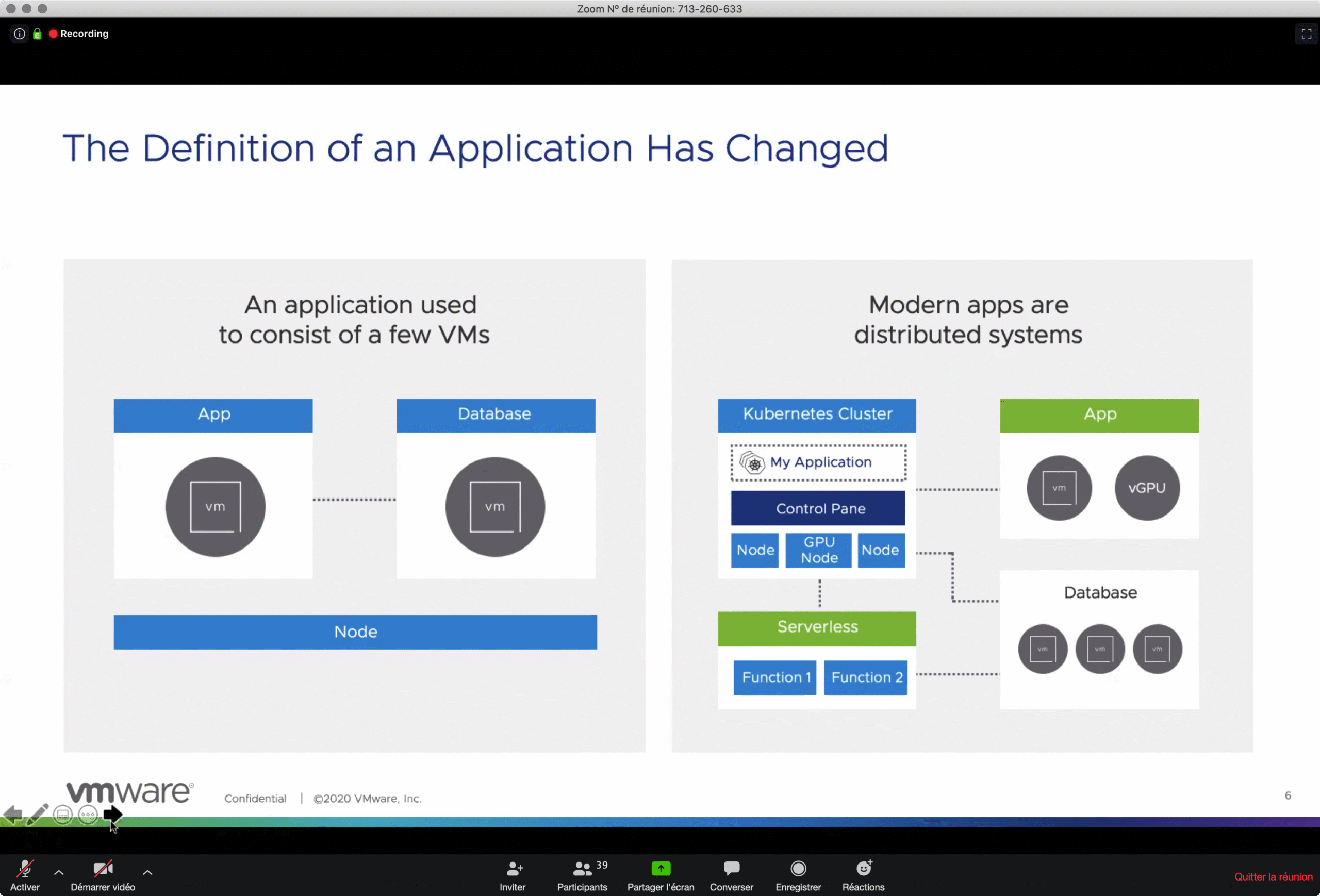 Tout d’abord, VMware a présenté sa stratégie pour les 5 ans à venir avec vSphere 7 et surtout pourquoi elle prenait cette voie. d’ailleurs, ce n’était pas une nouveauté, la société en ayant déjà parlé longuement lors des conférences des deux derniers VMworld avec les projets Pacific et Tanzu. Depuis la démocratisation du cloud public et hybride ses 5 dernières années, il semble bien que toute l’IT continue sur sa lancée et convertisse petit à petit les éditeurs de logiciels aux containers et tout ce qui en découle : les fameuses « Cloud Native apps ». Dans cette logique, il était évident que si VMware voulait augmenter ses parts de marché au sein de ce nouvel écosystème tout en maintenant son hégémonie sur la virtualisation x86, elle devait embrasser complètement les technologies phares comme Kubernetes et les fondamentaux associés. vSphere 7 a été conçu dans cette optique avec l’intégration de l’orchestrateur au sein même du moteur.
