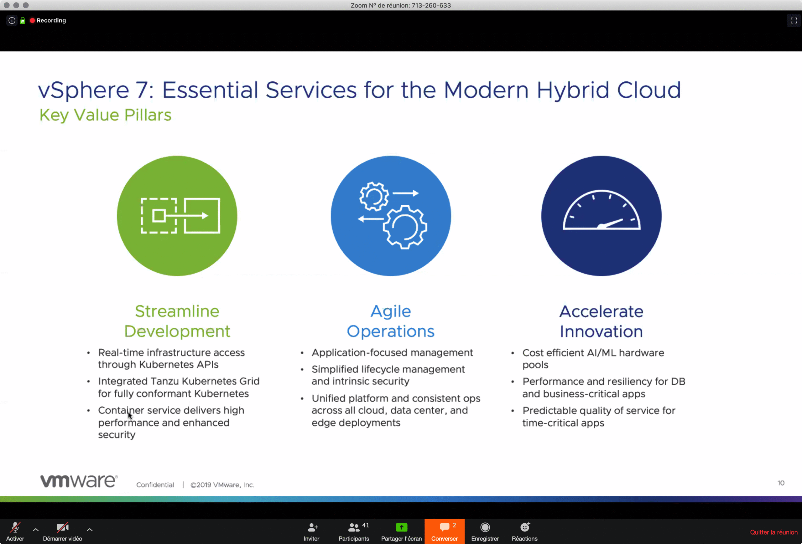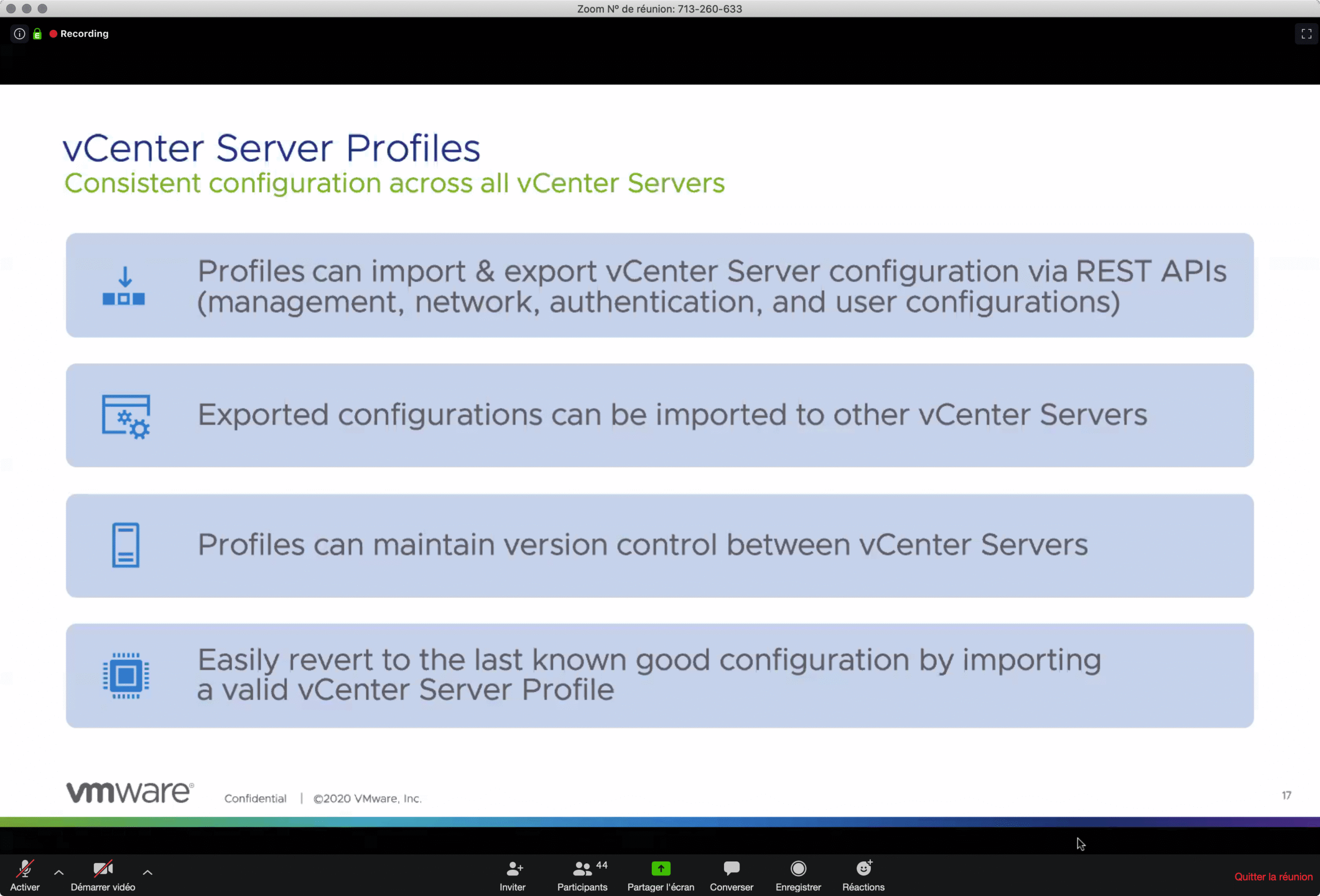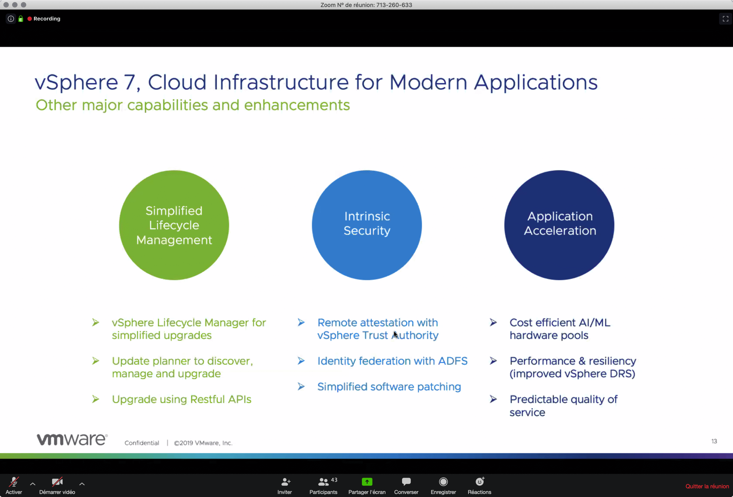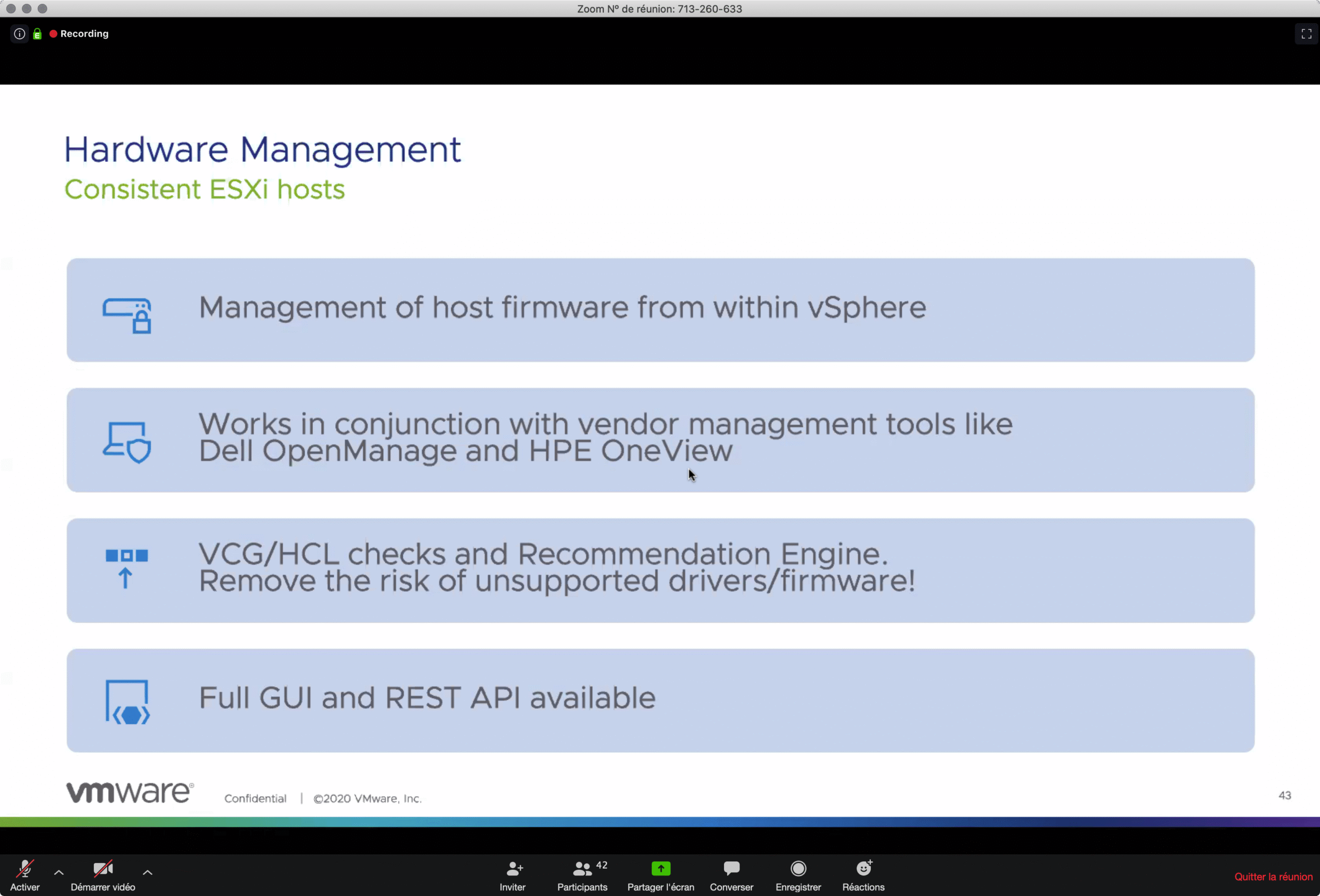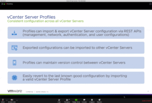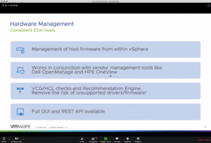 En introduction, sachez que les vExpert bloggers ont été invités à partir de la mi-février à toute une série de sessions présentant les différents aspects de vSphere 7, auxquelles j’ai pu participer en partie. Par rapport notre niveau de production, je me suis surtout concentré sur les nouveautés de vCenter et ESXi, évidemment, le noyau dur.
