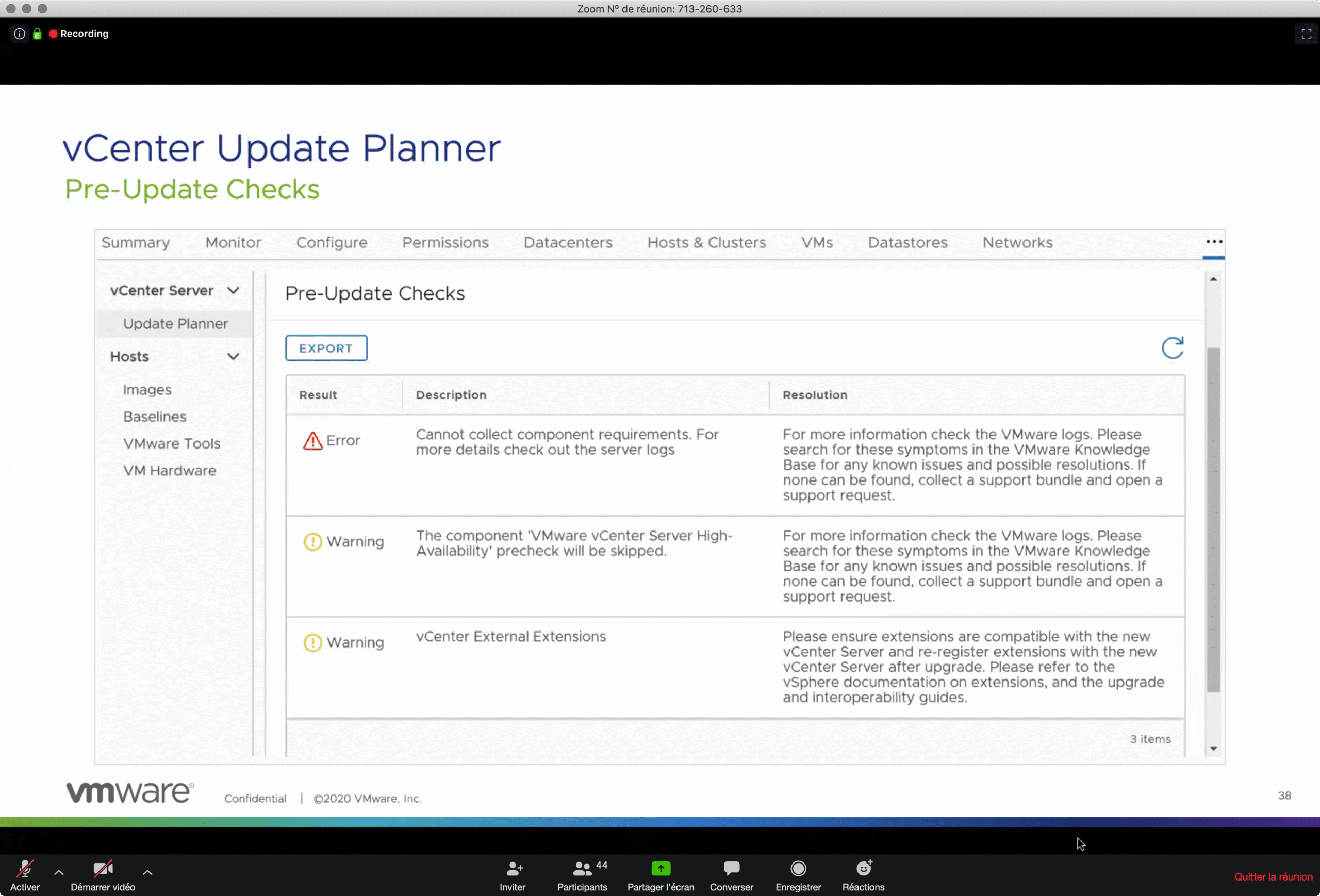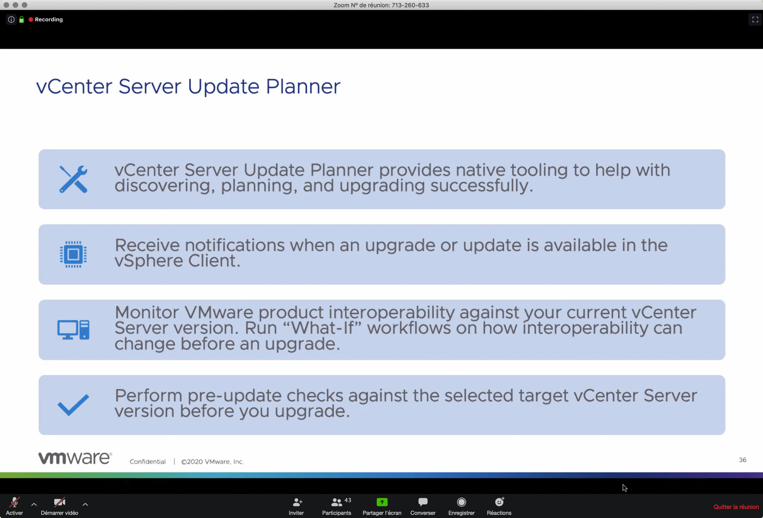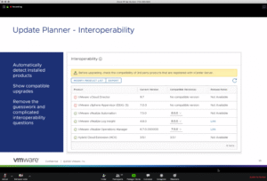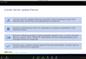 – vCenter Update Planner : vous pouvez désormais planifier plus facilement vos mises à jour vCenter avec notamment une gestion des compatibilités de vos composants directement intégré au sein du produit.