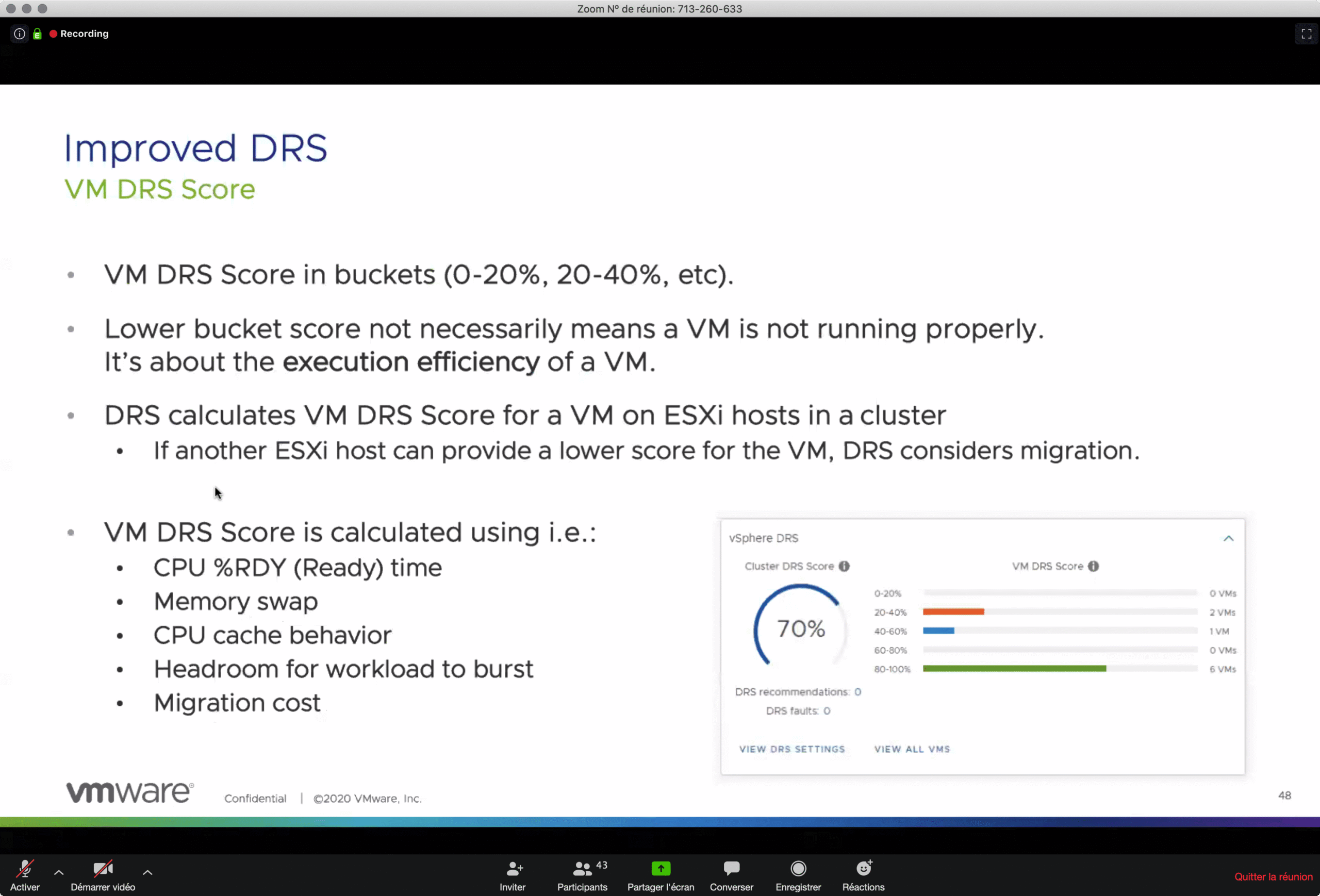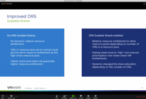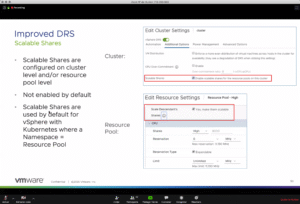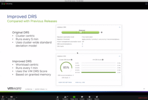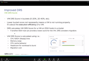 DRS continue d’évoluer lui aussi. Ici, c’est tout le moteur d’exécution et la philosophie qui ont été revus. En effet, DRS n’est plus basé sur l’équilibrage globale des cluters, mais se focalise désormais sur la notion de Workload (VM et Containers donc) et sur la mémoire consommée. DRS intègre également dans ses calculs la coût d’une migration (vMotion n’est pas neutre sur une infrastructure de production).