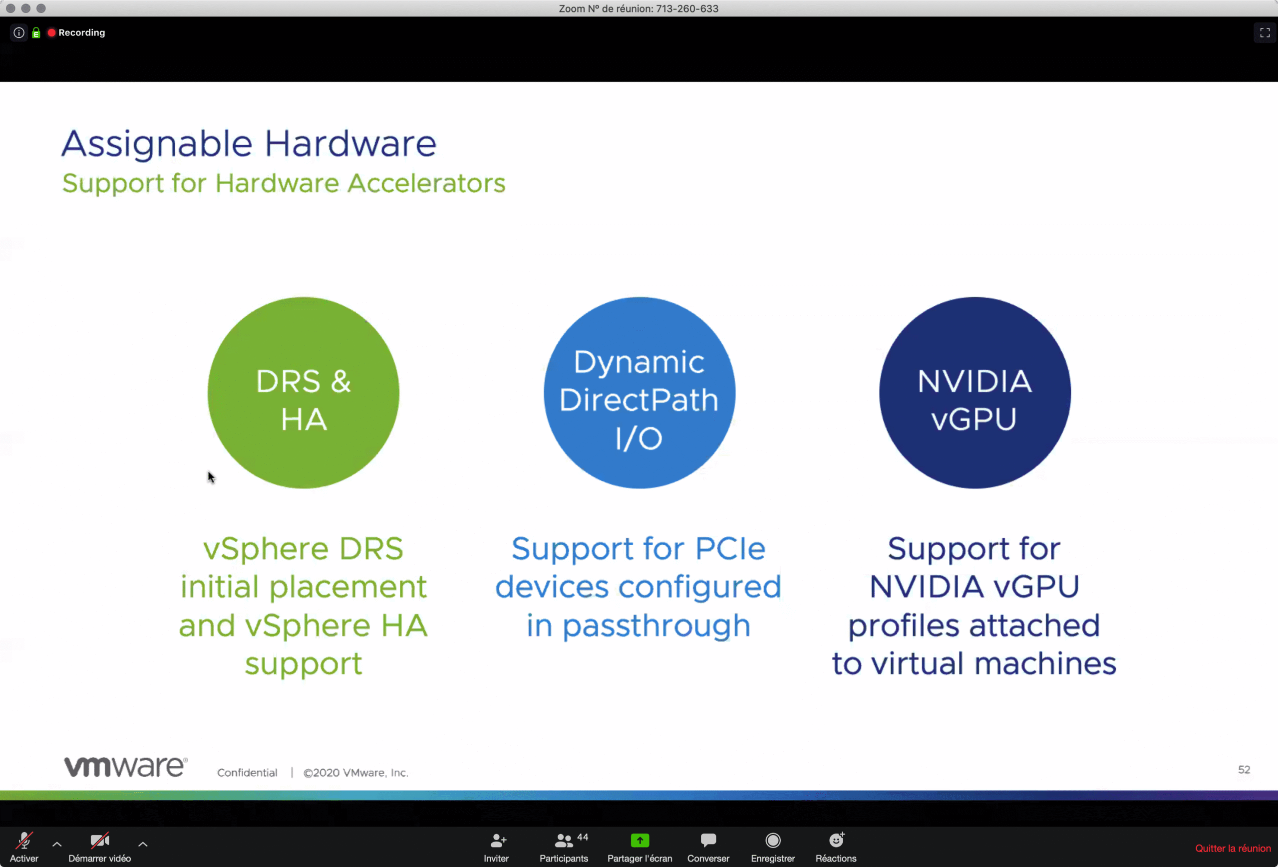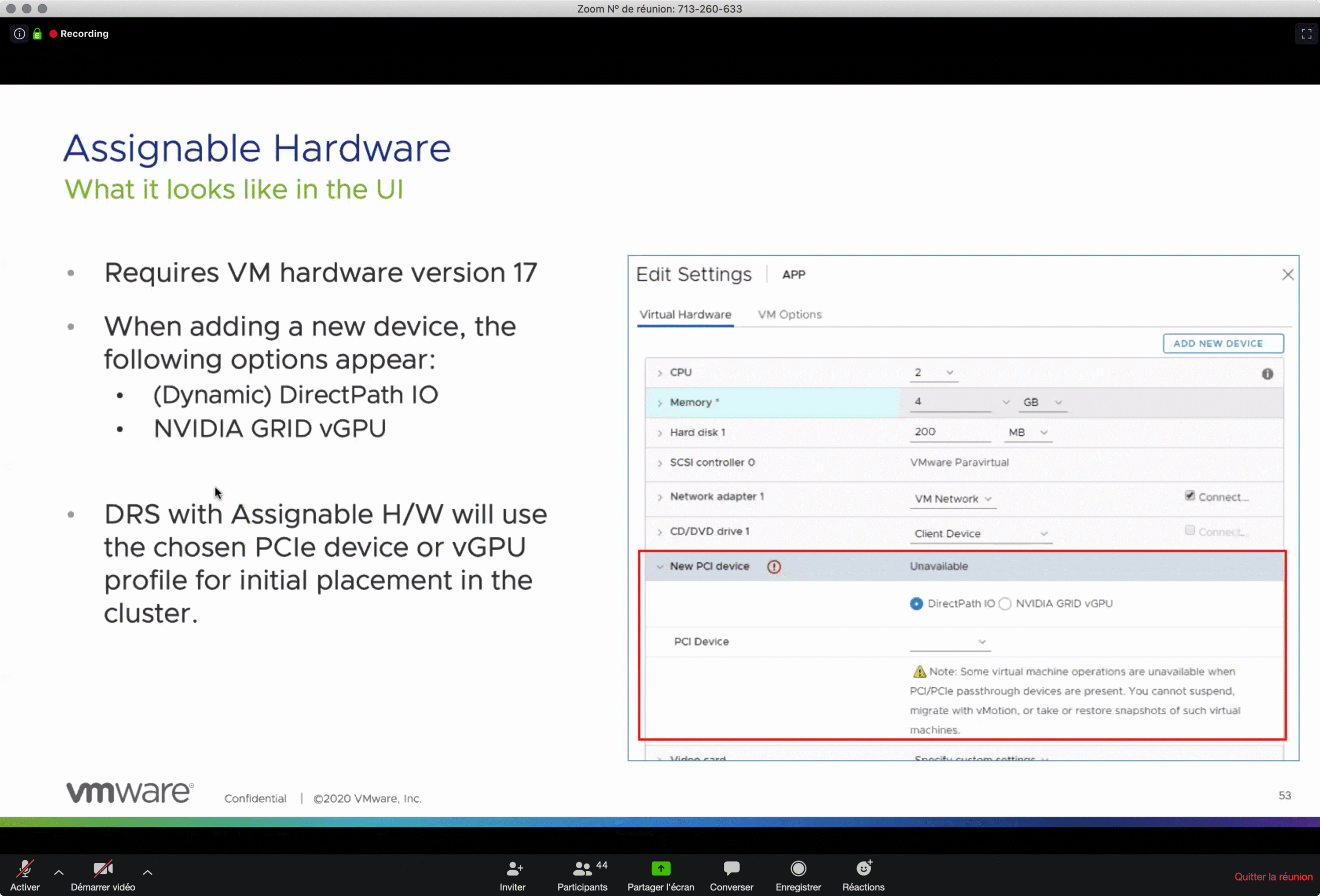 Il existe aussi une nouvelle option sur le hardware des VMs, dite « Assignable Hardware » (VM Hardware à partir de la version 17) qui permet à DRS de placer les VM sur les serveurs disposant de cette ressource. Jusqu’à présent vous deviez mettre en place des règles DRS spécifiques pour que la ou les VMs ayant des ressources de ce type restent « collées » aux machines en disposant. On pense notamment aux VMs attachées à des ressource GPGPU, d’autant qu’il est explicitement fait référence à NVIDIA GRID dans la présentation ! Ce sera notre cas bientôt, un cluster ESXi avec du GPGPU sur certains hôtes, je ne manquerai pas de tester tout ça sur un environnement de pré-production.