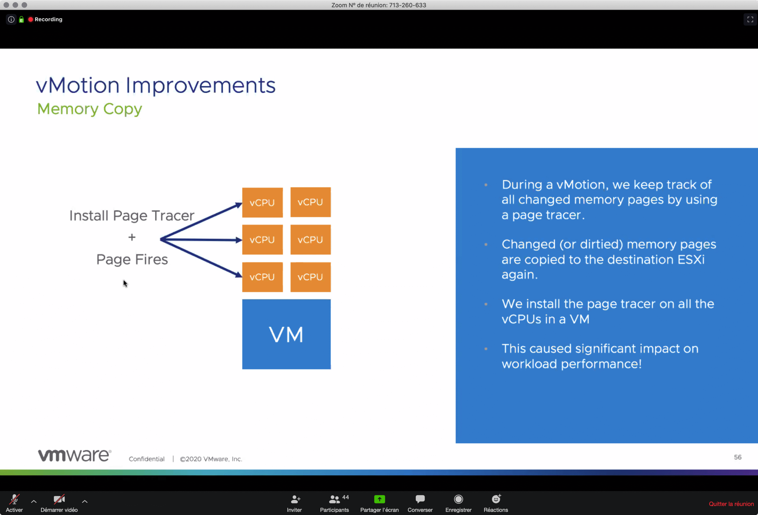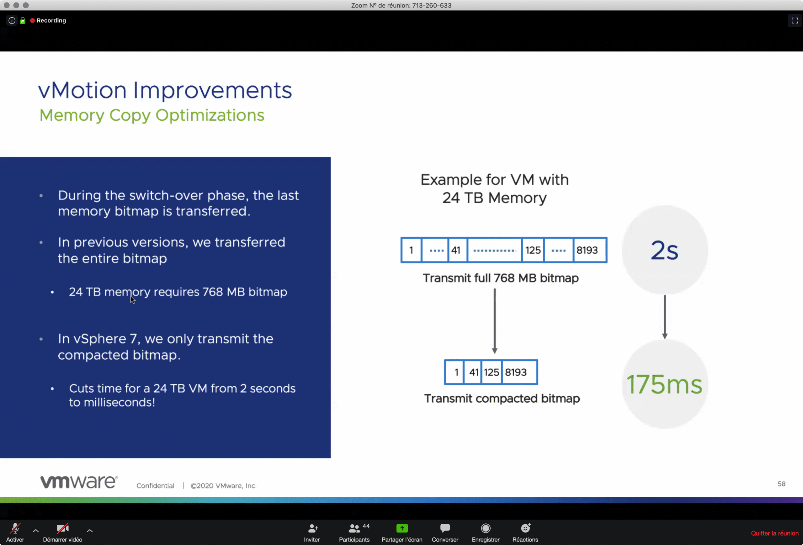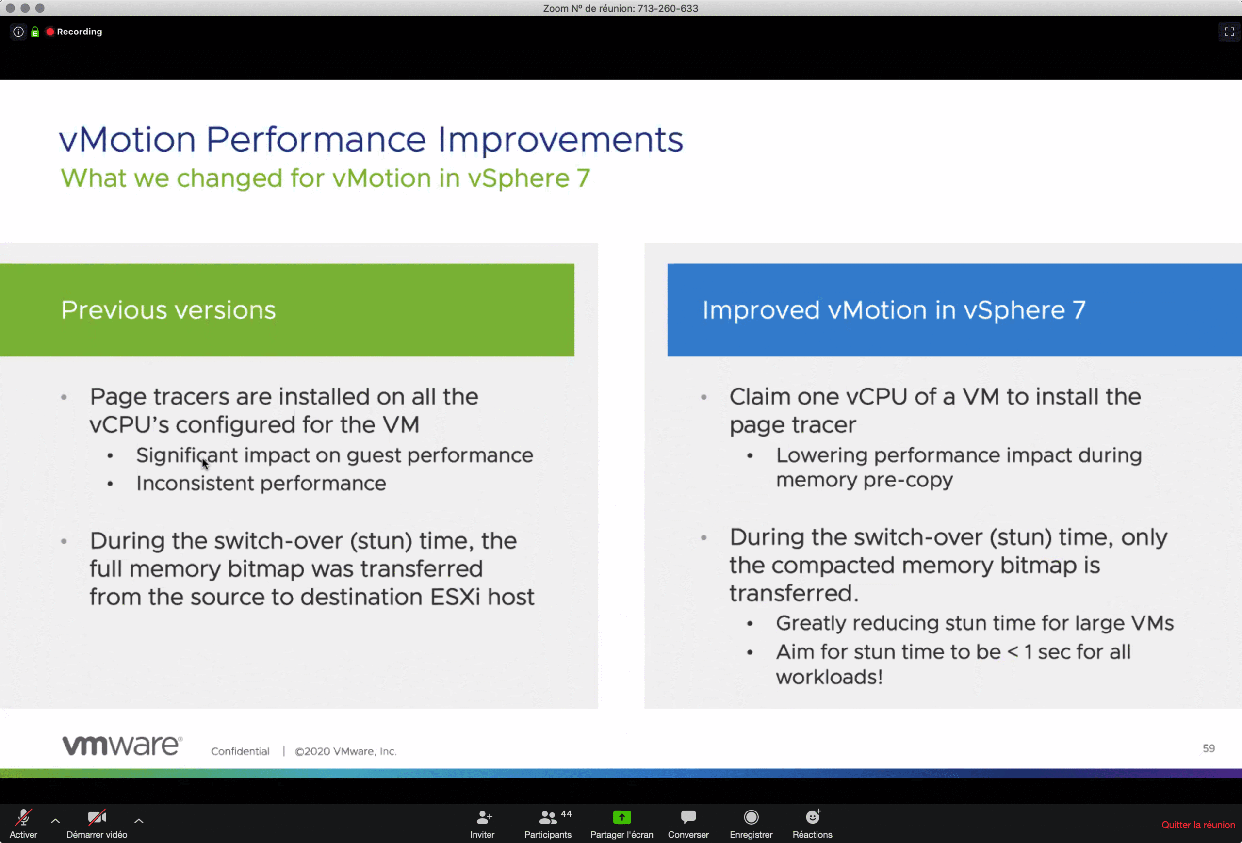 Sous vSphere 6, vMotion installait des « page tracers » (loggeur de changement dans les pages mémoire) sur chaque vCPU, ce qui avait un impact sur l’ensemble des coeurs de la VM elle-même. Maintenant, vMotion installe un page tracer sur un seul des vCPU. De même, lors du dernier transfert de bloc mémoire, vMotion envoie désormais une bitmap compressée et non plus l’image résiduelle, ce qui réduit énormément ce qu’on appelle le « Stun Time », le temps de « figeage » de la VM lors de sa bascule vers l’hôte cible.