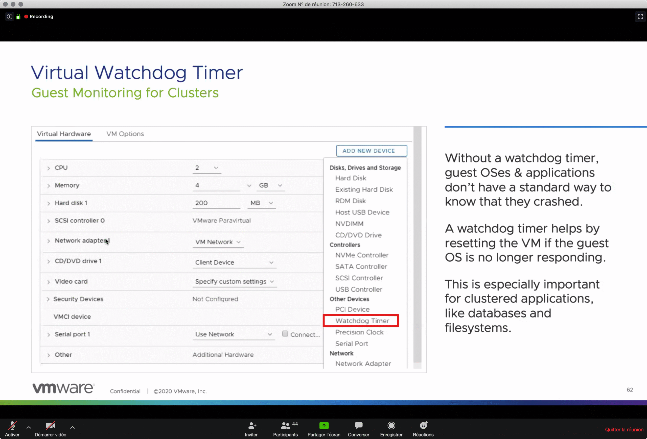 – Fonction Watchdog timer : vous pouvez déclarer ce type de contrôle dans une VM. Celui permet de redémarrer automatiquement une VM sile guest fait un kernel panic ou un BSOD.
