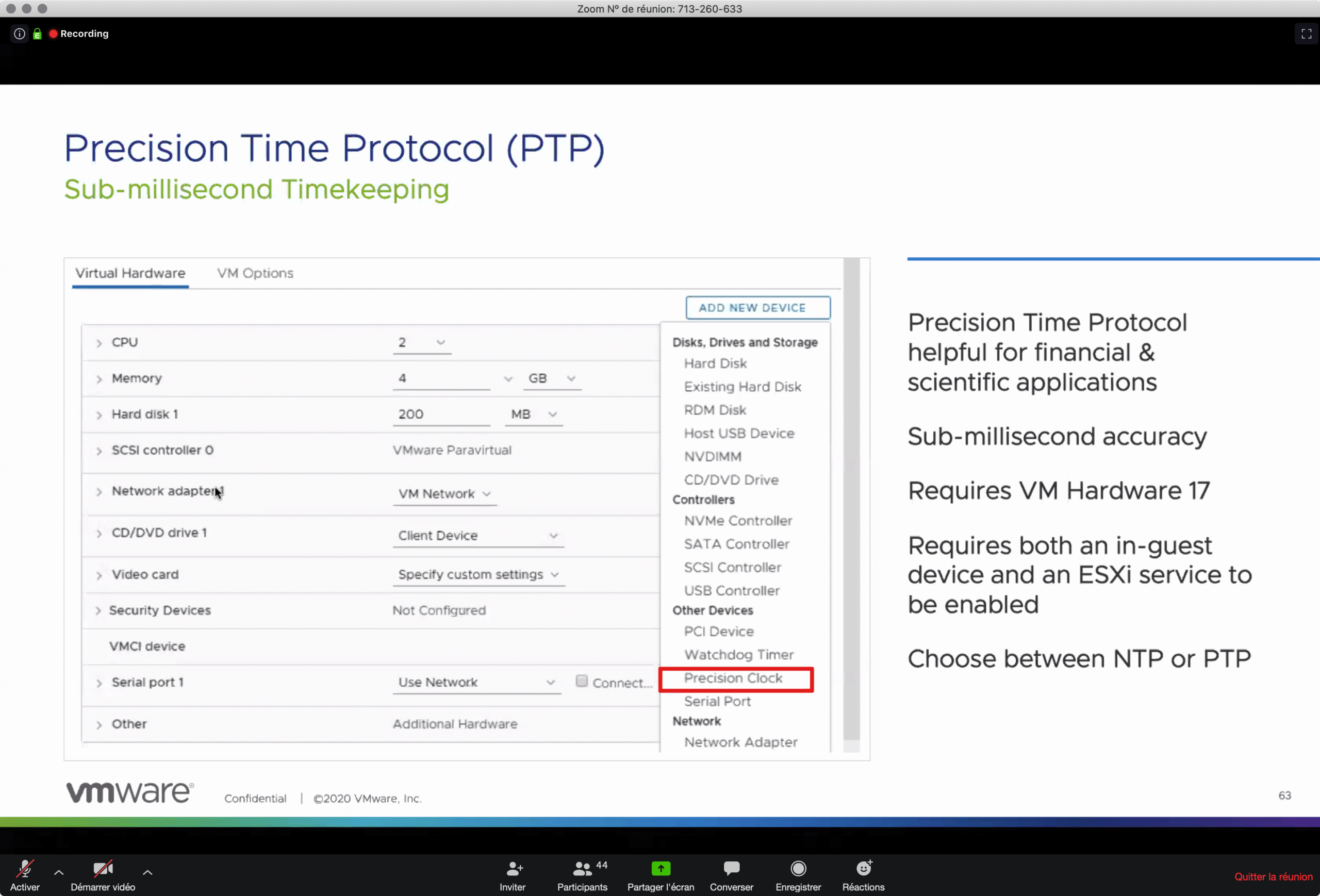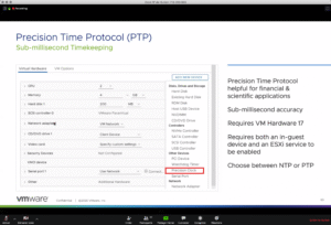 – Fonction PTP : pour certaines applications scientifiques ou financière, l’horloge se doit d’être synchronisé à la micro-seconde quelques fois. Vous le savez sans doute, mais une VM, même connectée à un NTP, est potentiellement sujette à une forme de drifting de son temps propre. Cette fonction, qui nécessite un composant de VM mais aussi un service spécifique à installer dans le guest, permet de réduire ce décalage à un niveau compatible avec les applications sensibles.