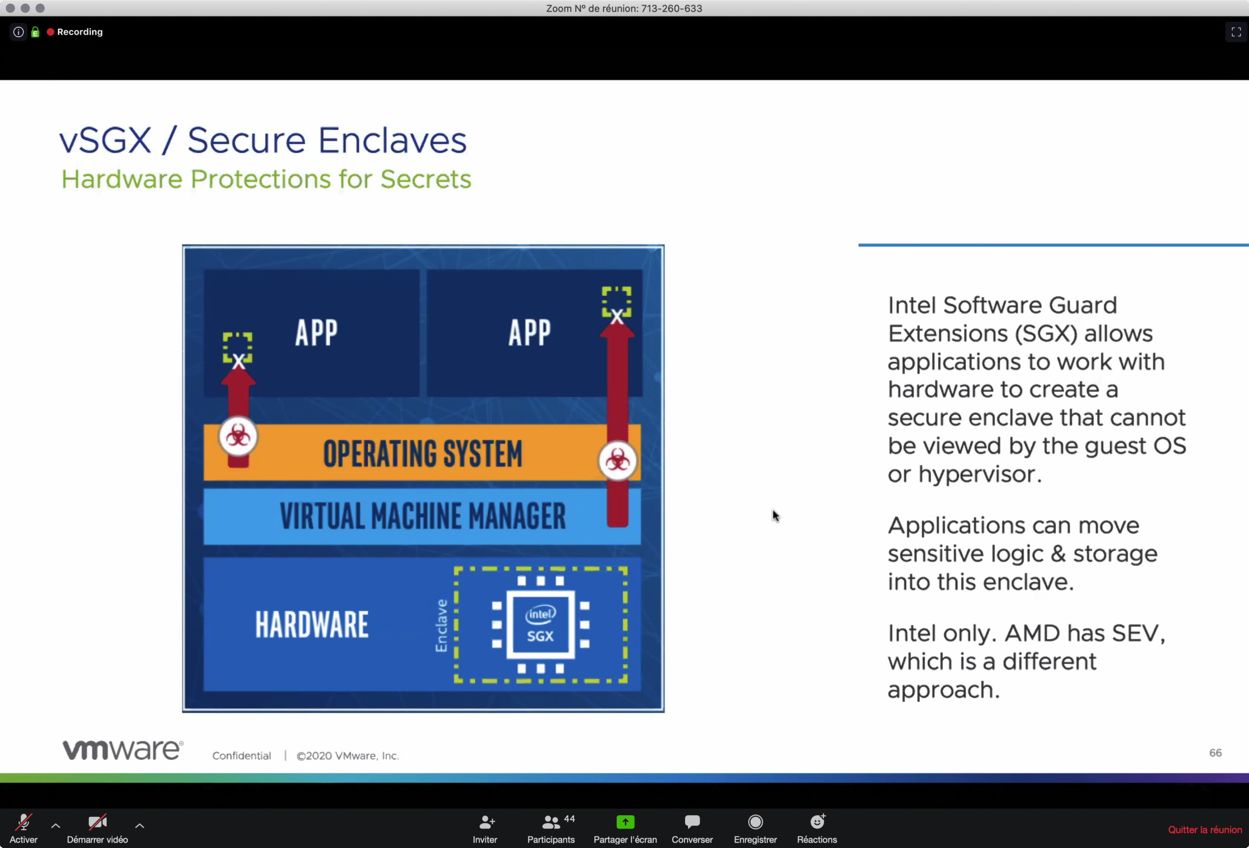 Les VM en hardware 17 sont désormais capable de fournir l’accès à aux enclaves sécurisées du hardware sous-jacent (exploitation des extension SGX d’Intel). Pour ceux qui ne voient pas trop ce que cela recoupe, c’est le même système qui est utilisé par Apple sur ses iPhones/iPad disposant d’une portion mémoire sécurisée sur les puces Ax et qui permet de stocker vos caractéristiques biométriques (empreinte pour TouchID ou votre joli minois pour FaceID). Attention, par principe, ces espaces mémoire étant totalement inaccessibles directement et ne répondant que par des simples « ça match ou ça match pas » en général, impossible pour un ESXi de faire du vMotion ni même des Snapshots sur ce type de machine, forcément. Donc à réserver à des applications critiques et dont les contraintes opérationnelles sont compatibles avec une localisation hardware statique.