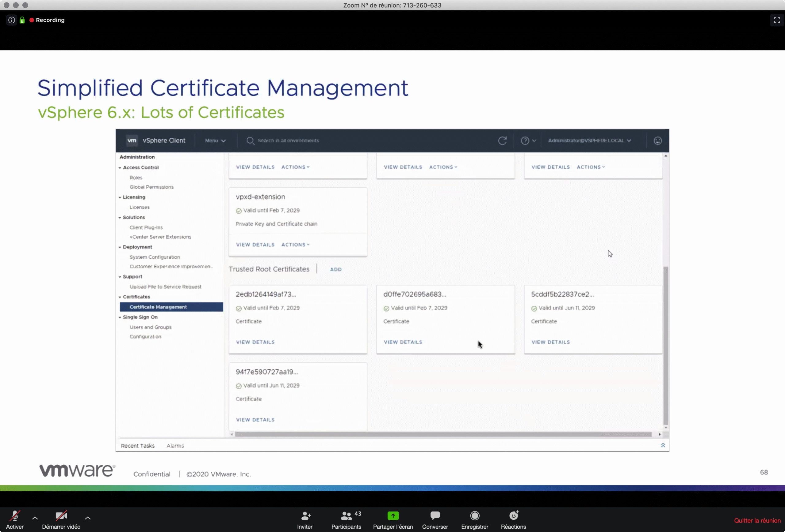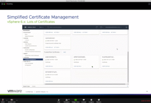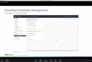 La gestion des certificats de vCenter, tiens oui parlons-en… Je ne sais pas combien de fois nous avons pu pester sur les milles et unes façons d’installer et mettre à jour des certificats VMware sur leurs solutions. En gros, je pense qu’il y en a au moins autant que de logiciels au catalogue et vCenter n’échappait pas à la règle avec, en plus, plein de certificats partout et dans tous les coins ou presque. Et bien, enfin, vCenter 7 propose un outil simple : plus qu’un seul certificat à mettre à jour, vous l’uploadez … hop, c’est fini ! En tout cas c’est la promesse de VMware, sur le papier … à voir dans la pratique ^^