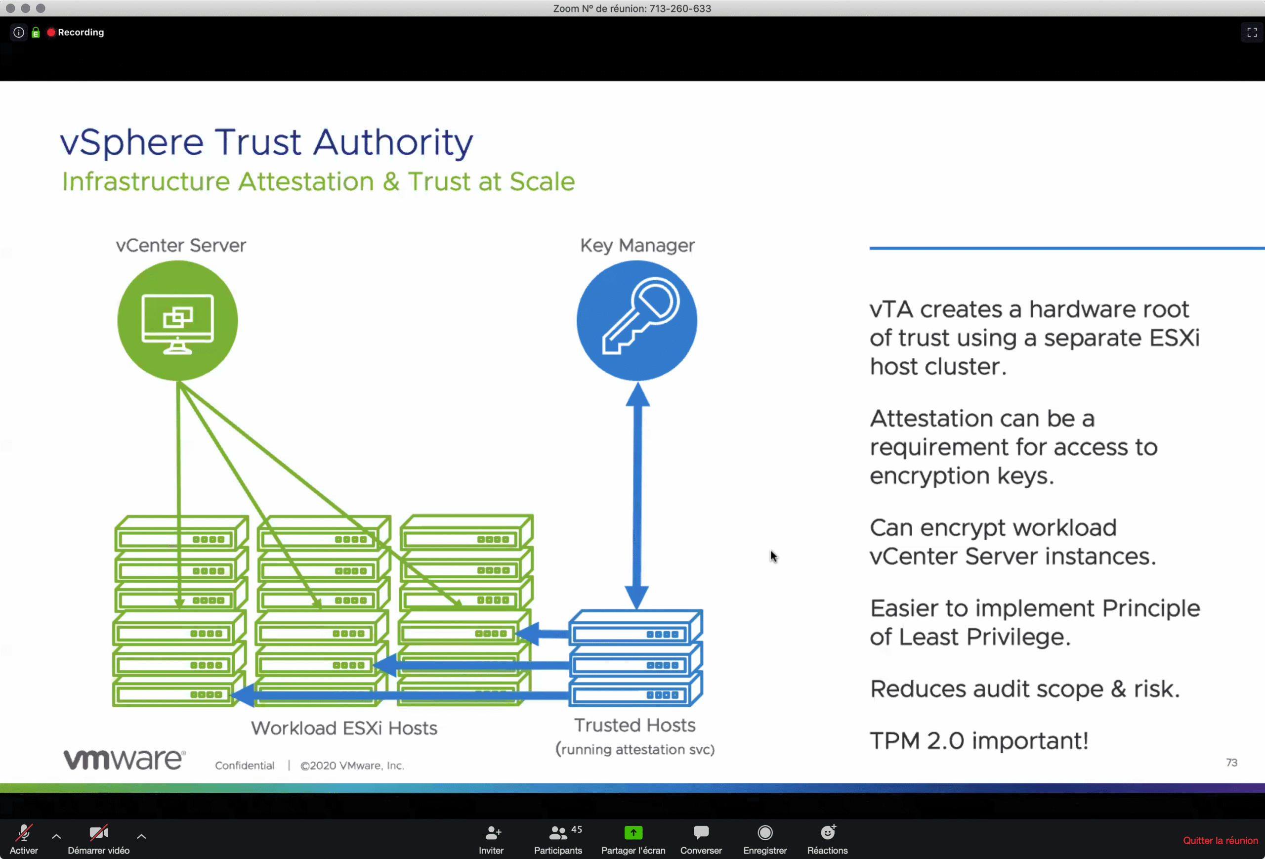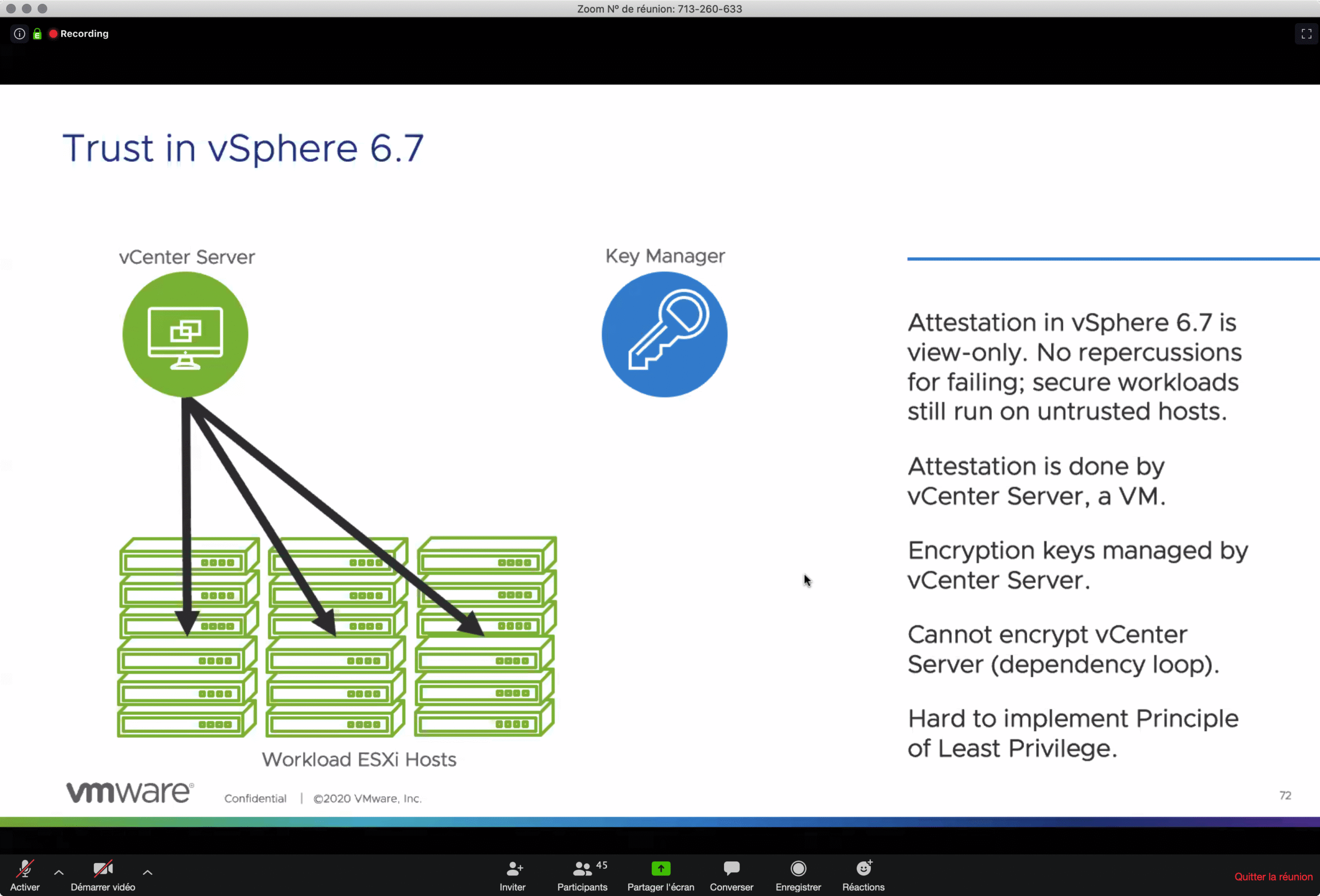 Concernant chiffrement des workloads sur disque, cela a toujours été difficile à mettre en oeuvre sous vSphere et surtout rendait vCenter extrêmement critique et sensible (trop par rapport à sa position au sein de la prod à mon sens), celui-ci hébergeant l’ensemble des clefs privées des ESXi, entre autre. Plus de vCenter ? Vous ne pouvez plus démarrer vos machines, ne serait-ce que ça. Désormais VMware propose de dédier un cluster spécifique « maître des clefs » et accédé directement par les hyperviseurs pour obtenir leurs clefs. Certes, c’est encore un cluster de plus, mais quand le chiffrement est une obligation, cela fait sauter pas mal de limitations présentes dans vSphere 6. Je vous laisse regarder les slides qui sont un peu plus précis sur le sujet.