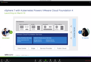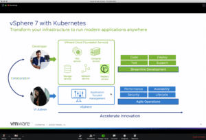 Tout d’abord, VMware a présenté sa stratégie pour les 5 ans à venir avec vSphere 7 et surtout pourquoi elle prenait cette voie. d’ailleurs, ce n’était pas une nouveauté, la société en ayant déjà parlé longuement lors des conférences des deux derniers VMworld avec les projets Pacific et Tanzu. Depuis la démocratisation du cloud public et hybride ses 5 dernières années, il semble bien que toute l’IT continue sur sa lancée et convertisse petit à petit les éditeurs de logiciels aux containers et tout ce qui en découle : les fameuses « Cloud Native apps ». Dans cette logique, il était évident que si VMware voulait augmenter ses parts de marché au sein de ce nouvel écosystème tout en maintenant son hégémonie sur la virtualisation x86, elle devait embrasser complètement les technologies phares comme Kubernetes et les fondamentaux associés. vSphere 7 a été conçu dans cette optique avec l’intégration de l’orchestrateur au sein même du moteur.
