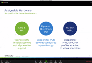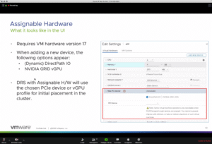 Il existe aussi une nouvelle option sur le hardware des VMs, dite « Assignable Hardware » (VM Hardware à partir de la version 17) qui permet à DRS de placer les VM sur les serveurs disposant de cette ressource. Jusqu’à présent vous deviez mettre en place des règles DRS spécifiques pour que la ou les VMs ayant des ressources de ce type restent « collées » aux machines en disposant. On pense notamment aux VMs attachées à des ressource GPGPU, d’autant qu’il est explicitement fait référence à NVIDIA GRID dans la présentation ! Ce sera notre cas bientôt, un cluster ESXi avec du GPGPU sur certains hôtes, je ne manquerai pas de tester tout ça sur un environnement de pré-production.
