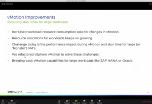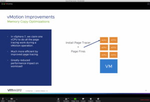 Sous vSphere 6, vMotion installait des « page tracers » (loggeur de changement dans les pages mémoire) sur chaque vCPU, ce qui avait un impact sur l’ensemble des coeurs de la VM elle-même. Maintenant, vMotion installe un page tracer sur un seul des vCPU. De même, lors du dernier transfert de bloc mémoire, vMotion envoie désormais une bitmap compressée et non plus l’image résiduelle, ce qui réduit énormément ce qu’on appelle le « Stun Time », le temps de « figeage » de la VM lors de sa bascule vers l’hôte cible.