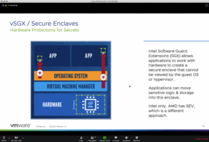 Les VM en hardware 17 sont désormais capable de fournir l’accès à aux enclaves sécurisées du hardware sous-jacent (exploitation des extension SGX d’Intel). Pour ceux qui ne voient pas trop ce que cela recoupe, c’est le même système qui est utilisé par Apple sur ses iPhones/iPad disposant d’une portion mémoire sécurisée sur les puces Ax et qui permet de stocker vos caractéristiques biométriques (empreinte pour TouchID ou votre joli minois pour FaceID). Attention, par principe, ces espaces mémoire étant totalement inaccessibles directement et ne répondant que par des simples « ça match ou ça match pas » en général, impossible pour un ESXi de faire du vMotion ni même des Snapshots sur ce type de machine, forcément. Donc à réserver à des applications critiques et dont les contraintes opérationnelles sont compatibles avec une localisation hardware statique.