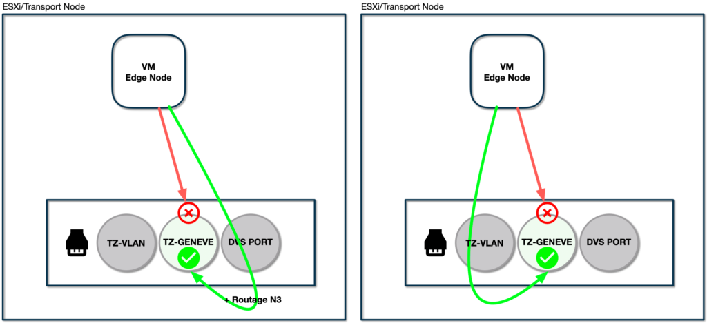 Rappelez-vous, les Edge Nodes n’arrivaient pas à discuter Geneve avec les Transport Node de mon installation NSX. Ca pinguait, mais il y avait au moins un comportement bizarre vis à vis des payload (la piste du MTU, donc). En réalité c’est le design de l’implémentation lui-même qui était spécifique et qui m’a enduit d’erreur. Comme déjà mentionné, les Edge Nodes sont des machines virtuelles directement montées sur le cluster constitué par les Transport Node. J’ai appris que dans cette configuration particulière, je vais le dire avec mes mots, une VM Edge Node ne sait pas discuter « de l’intérieur » avec un host ayant aussi le rôle de Transport Node. Plus simple encore : quel que soit votre setup, vos transport nodes ne peuvent capter et traiter du traffic geneve QUE depuis un port physique de la machine. Dans la pratique, sans trop se poser de question, vous avez deux solutions pour vous en sortir : soit router en N3 votre traffic GENEVE, en plaçant par exemple les Edges sur un autre subnet que vos transports nodes, soit utiliser non pas un portGroup de votre DVS mais carrément un segment NSX-T via la transport zone VLAN.